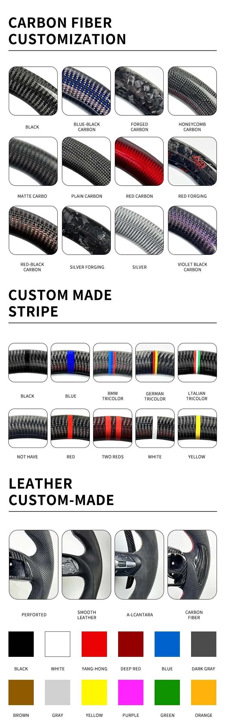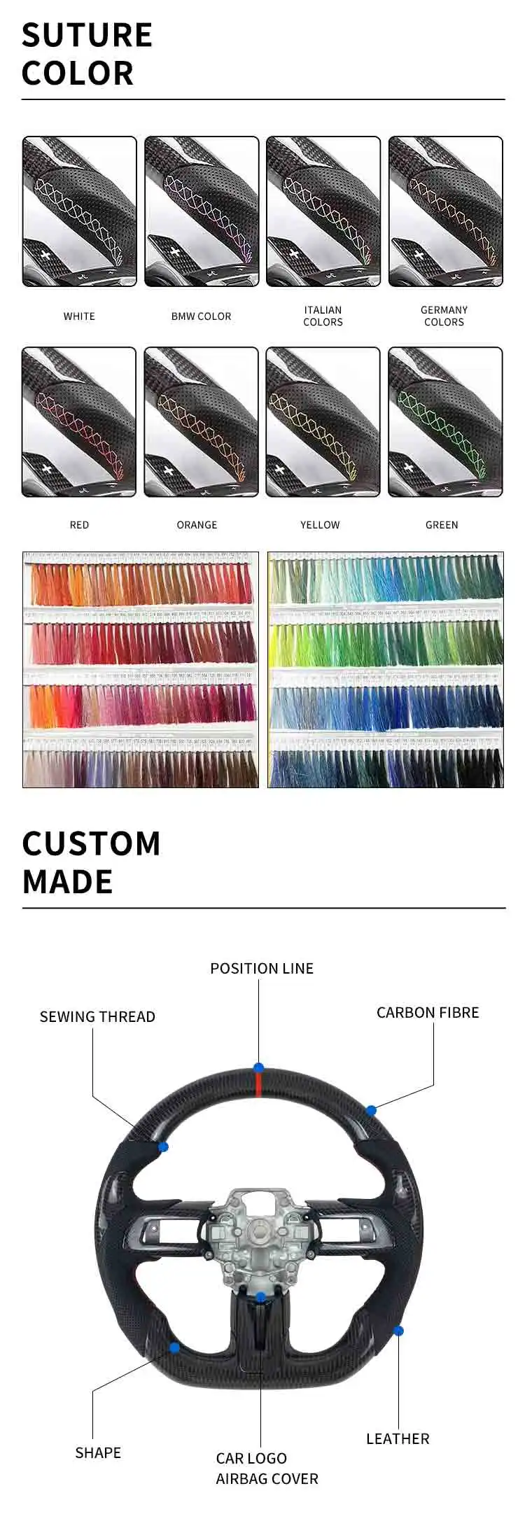 2. Product materials: real carbon fiber, leather, Suede, Alcantara, Forging...