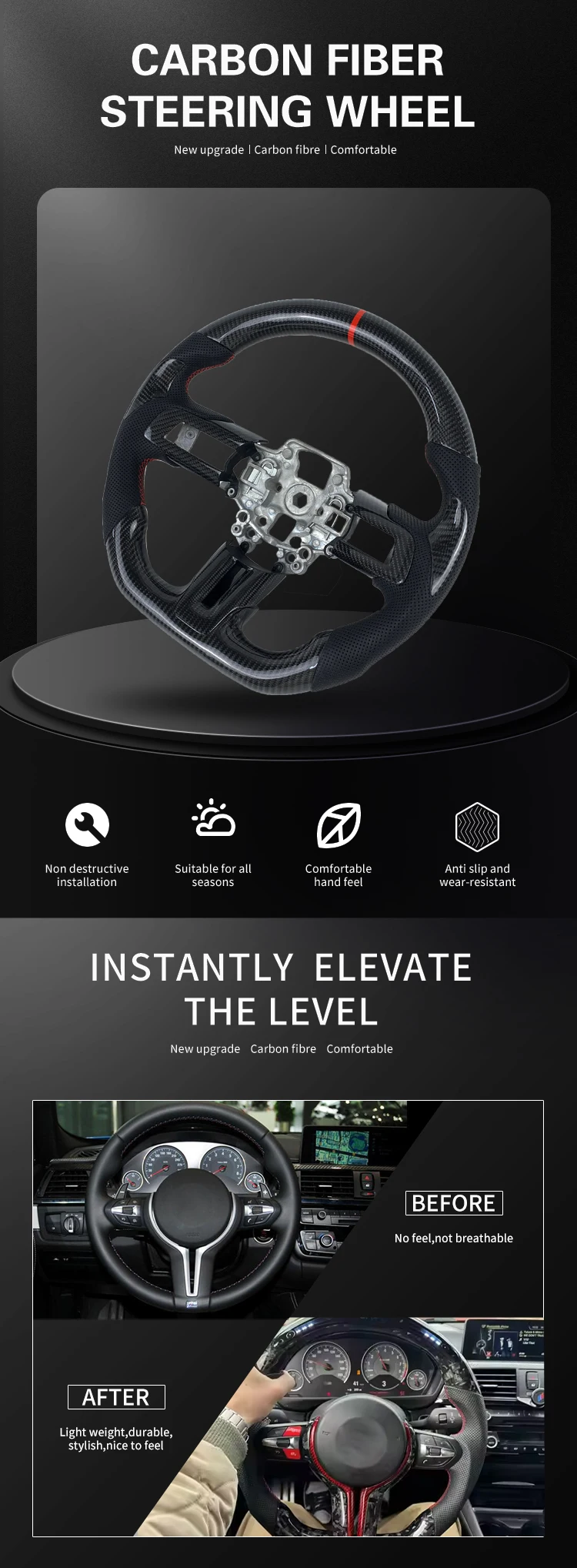 3. The product is processed and modified on the basis of the original steering wheel. Its installation is not damaged and will not affect the use of airbags and buttons.